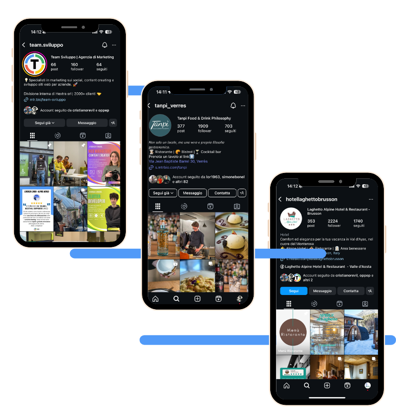 Gestiamo e promuoviamo le tue pagine aziendali su piattaforme Instagram e Facebook, Google MyBusiness, TripAdvisor, con campagne pubblicitarie mirate e contenuti che catturano l’attenzione e coinvolgono il tuo pubblico target.