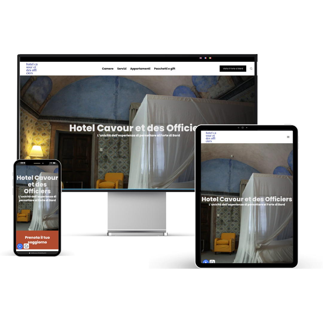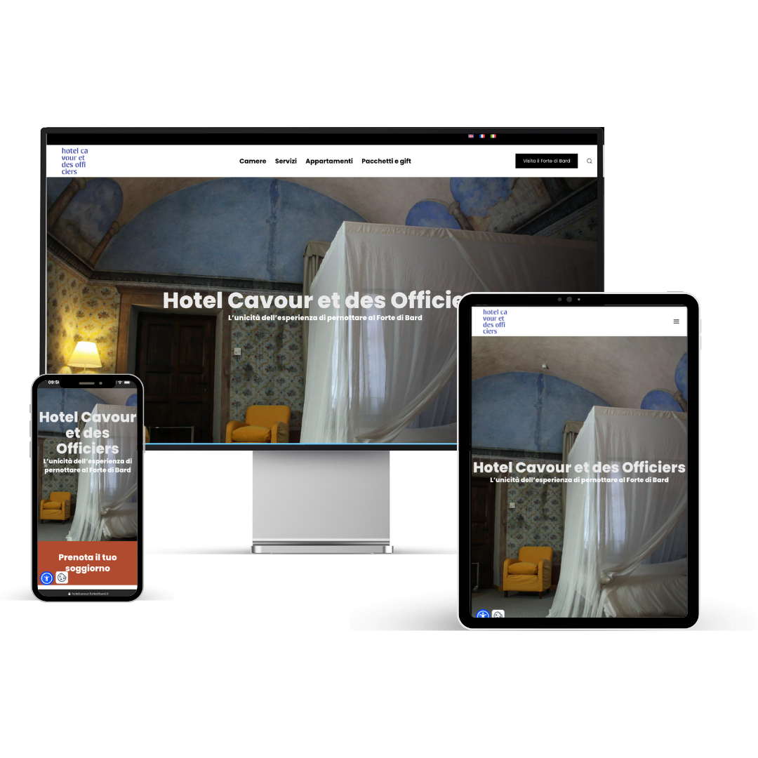 Ecco la sezione dedicata all’Hotel Cavour et des Officiers, integrata nel nuovo sito del Forte di Bard: una soluzione pensata per unire cultura e ospitalità in un’esperienza semplice, chiara e immediata. La navigazione è progettata per rendere la prenotazione un gioco da ragazzi, con un’interfaccia multilingua e un widget di accessibilità , così che informazioni e servizi siano davvero alla portata di tutti.