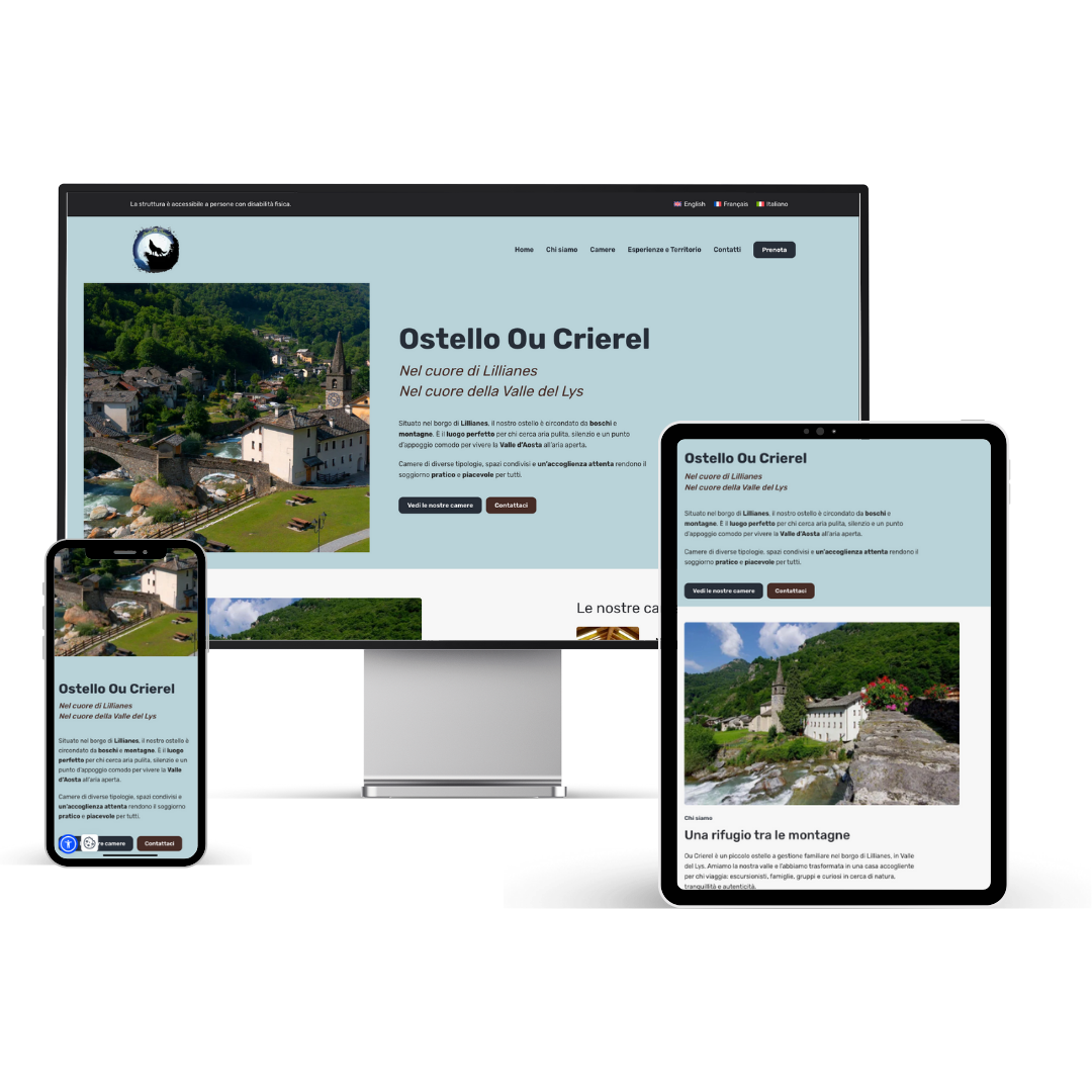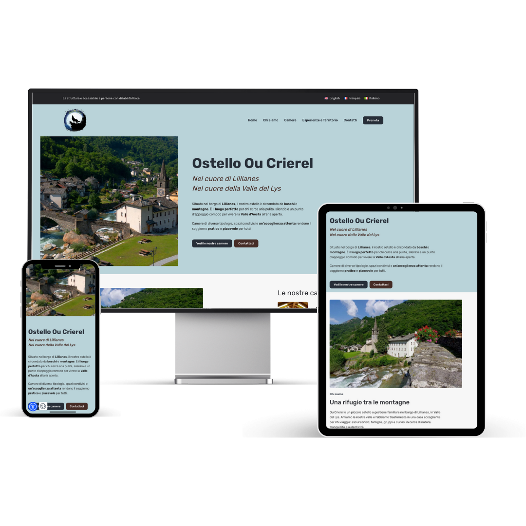 Nuovo sito per l’Ostello OU Crierel a Lillianes: un progetto di restyling pensato per valorizzare la struttura e offrire un’esperienza di navigazione moderna, responsive e accessibile. Il sito è caratterizzato da uno stile semplice e immediato, e permette di richiedere direttamente la disponibilità della camera in pochi passaggi, per rendere tutto più veloce e pratico per l’utente.