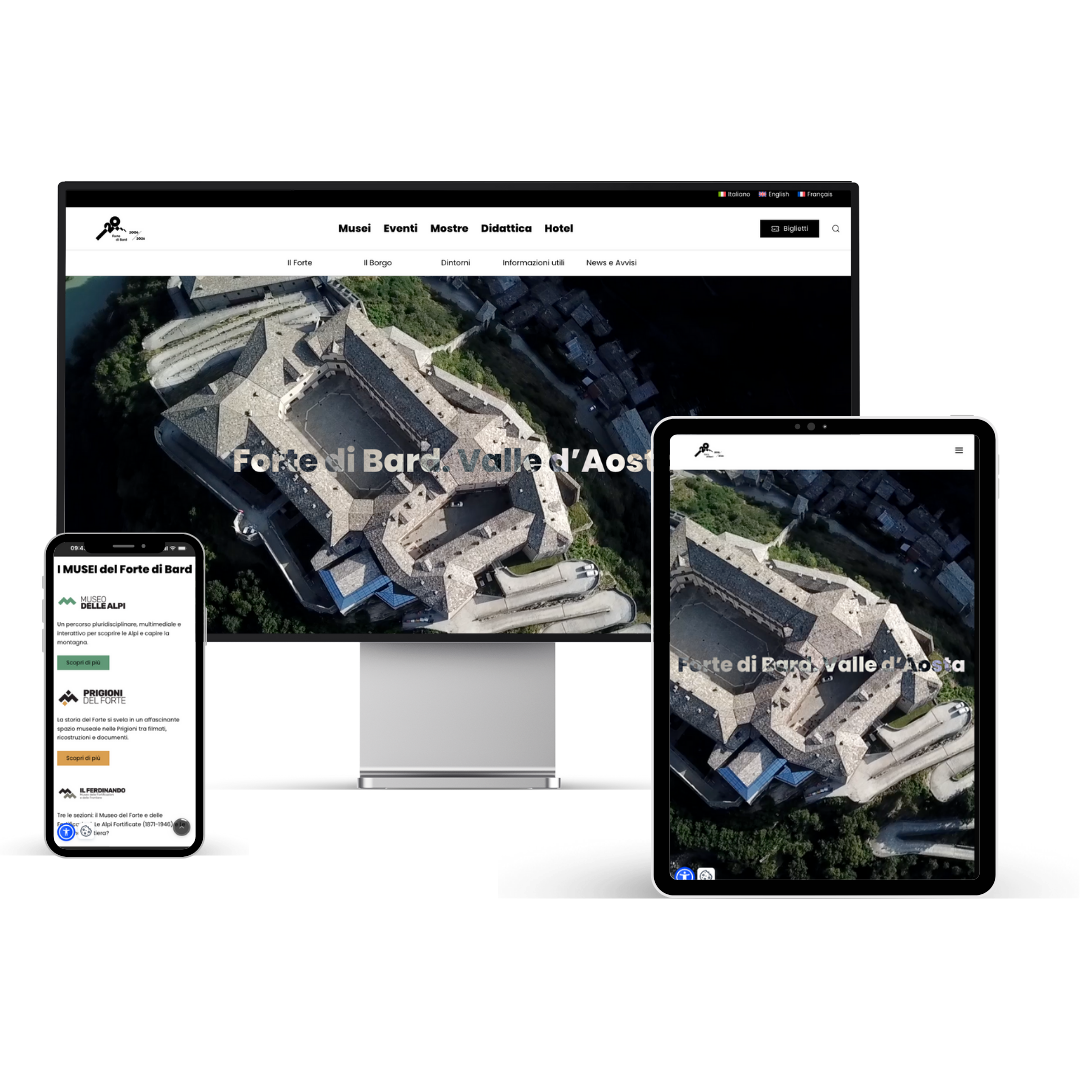 Il nuovo sito web del Forte di Bard: un progetto pensato per valorizzare al massimo cultura e territorio, con uno stile chiaro, moderno e immediato. Abbiamo ottimizzato l’architettura creando un menù snello che dà risalto a mostre, musei ed eventi, con calendario integrato per non perdere nessun appuntamento, e ai meravigliosi dintorni. Il sito è inoltre multilingua e dotato di widget di accessibilità , per offrire un’esperienza inclusiva e davvero alla portata di tutti.